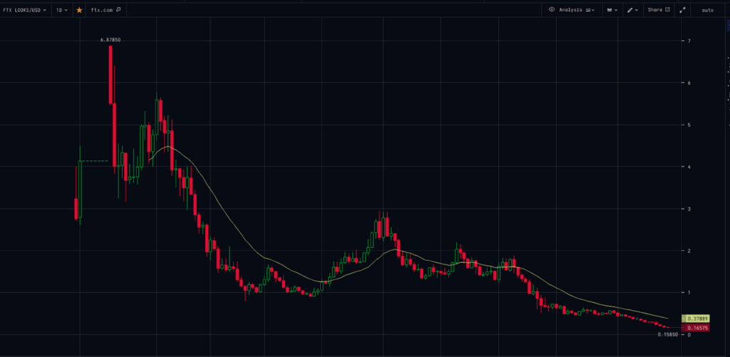 График курса LOOKS/USD на FTX, предоставленный Cryptowat.ch. В январе 2022-го LOOKS торговался по $2.6, а сейчас его цена около $0.17 — обвал примерно на 95%. Максимальная цена LOOKS — $6.87, а значит, относительно максимума падение составило и вовсе 98%.