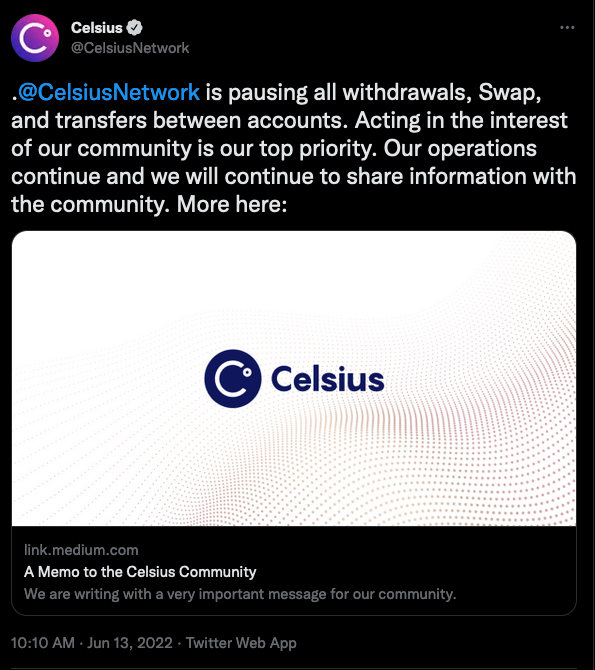 Celsius приостанавливает вывод, обмен и переводы между аккаунтами. Мы идем на этот шаг во благо нашего сообщества. Остальная деятельность продолжается, и мы будем делиться информацией с нашим сообществом.