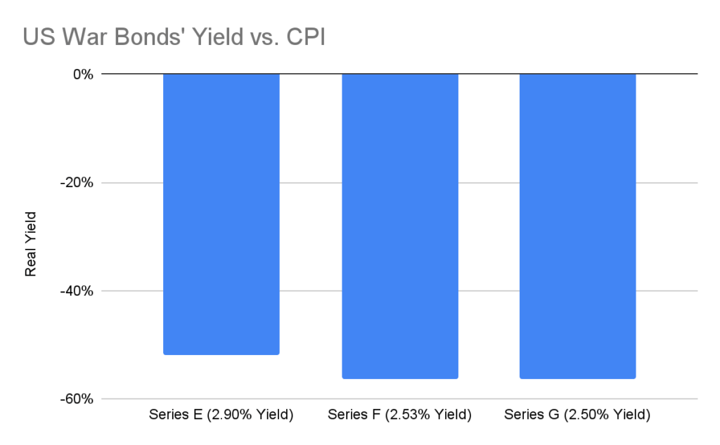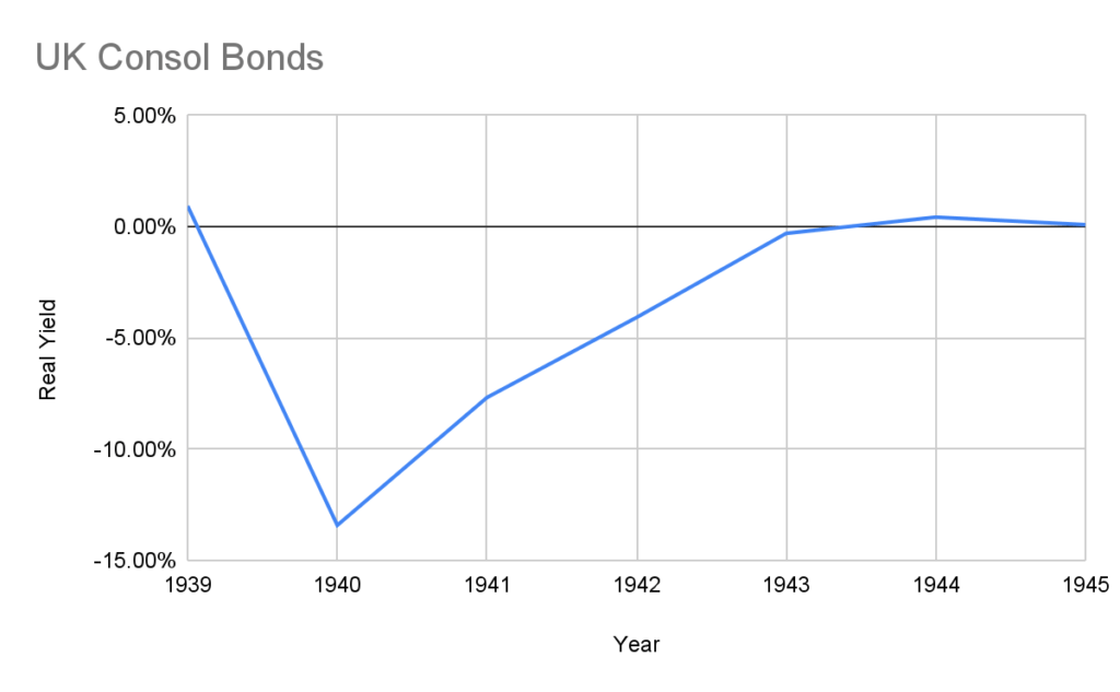 Возвращаясь к теме Второй мировой войны, напомню, что флаги ввели контроль за движением капитала и их внутренний капитал застрял внутри страны, а простакам были доступны ограниченные возможности для инвестиций. Что же дальше правительство сделало для того, чтобы получить капитал своих граждан и направить его на военные нужды? Оно с радостью предоставило долговые обязательства для своих патриотов, чтобы они смогли финансово поддержать боевые действия. Там, где это было возможно, я постарался составить численную сводку реальной доходности различных военных облигаций или других гособлигаций, выпущенных во время или после войны.