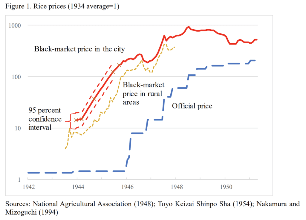 Из графика выше видно, что «реальная» цена риса была почти в 10 раз выше официальной. Учитывая, что основные продукты питания были сильно нормированы, если вы хотели есть в свое удовольствие или просто получать хотя бы какую-то еду, то вам надо было платить высокую цену за рис. Если только ваш доход не увеличился в 10 раз после начала войны, то вы, скорее всего, оказались на 90% беднее в пересчете на рис тех фиатных бумажек, которые вы прятали в матрасе. Риторический вопрос: сколько стоят фиатные деньги, если вы даже не можете позволить себе миску риса?