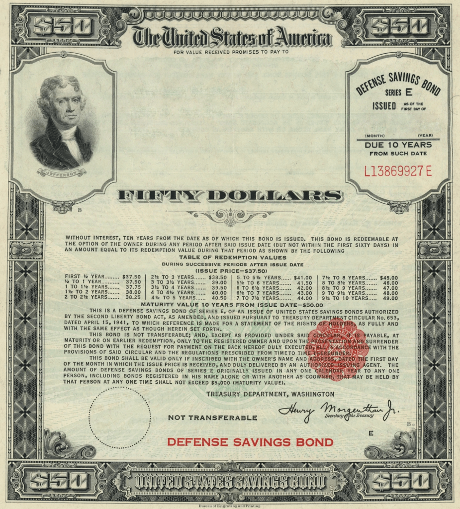 В период с 1941 по 1945 гг власти США выпустили $186 млрд в военных облигациях. Ниже представлено фото одной из них.