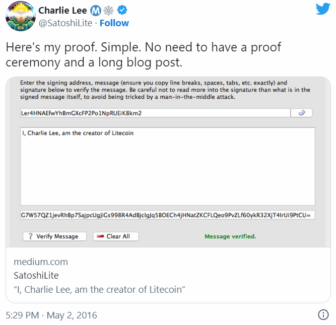 Если бы Крейг Райт действительно был создателем биткоина, доказательство было бы тривиальным. Достаточно было бы сделать так, как Чарли Ли, всего одним постом доказавшим, что он создатель Litecoin.