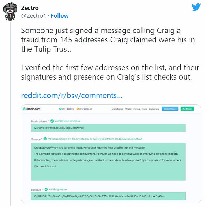«Крейг Стивен Райт — лжец и мошенник. У него нет ключей, чтобы подписать это послание. Мы все Сатоши».