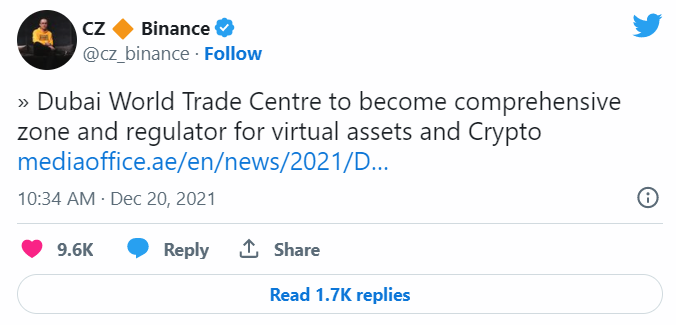 Благодаря «криптозоне» глава Binance Чанпен Чжао рассматривает возможность переноса в страну главного офиса криптобиржи. «Всемирный торговый центр Дубая станет полноценной [крипто] зоной и регулятором виртуальных активов и криптовалют», написал он в Twitter.