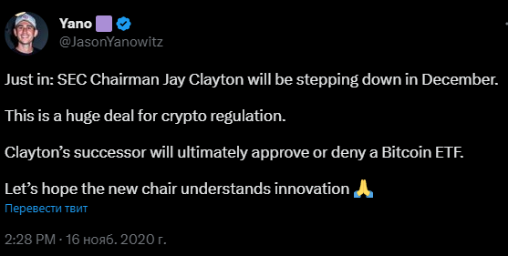 Свежие новости: Председатель Комиссии по ценным бумагам и биржам Джей Клейтон уйдет в отставку в декабре. Это очень важный момент в вопросе регулирования крипторынка. Ведь именно преемник Клейтона решит судьбу биткоин-ETF. Будем надеяться, что новый Председатель понимает ценность инноваций. Источник