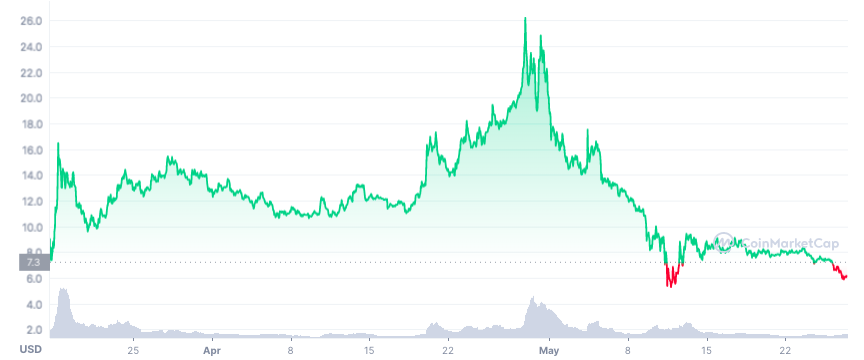 Торги ApeCoin начались 17 марта почти на всех крупнейших биржах. За два месяца актив показал себя как очень волатильный. На старте токен стоил около $9, затем быстро опустился до $6, взлетел до $17.75, месяц колебался между $10 и $15, перед продажей земли в Otherside преодолел $26, после чего начал снижаться и сейчас стоит около $6.15. Капитализация проекта — $1.8 млрд, это 34-е место на рынке, по данным CoinMarketCap.