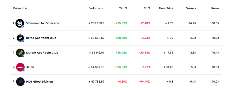 Otherside — самая популярная NFT-коллекция по объему торгов за последний месяц. Источник