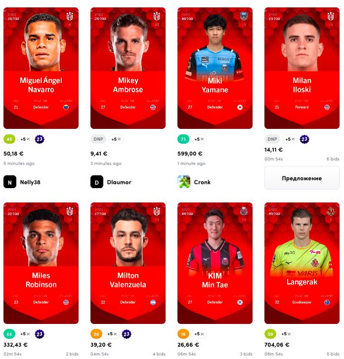 При этом чем результативнее и популярнее футболист, тем дороже токен с ним и тем ограниченнее его тираж. Цены на карточки разнятся от пары евро до нескольких тысяч. Пользователи могут как торговать токенами, так и участвовать с ними в турнирах разного уровня, зарабатывая баллы, редкие карточки и денежные призы.
