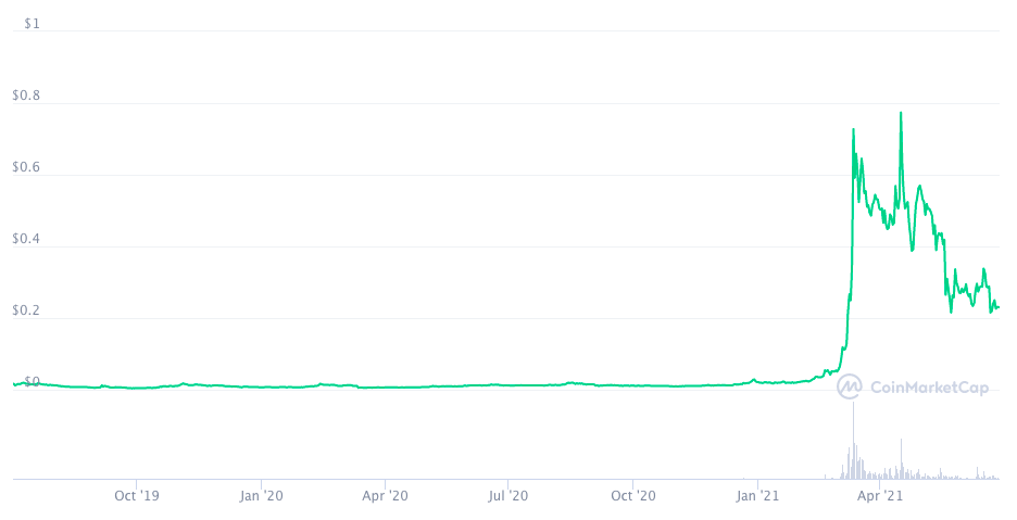 Токен CHZ был запущен в июле 2019 года, когда его стоимость составляла $0.016. Сейчас его цена поднялась до $0.24 — рост на 1 340%. А капитализация выросла до $1.36 млрд. На пике в апреле цена токена доходила $0.7739.