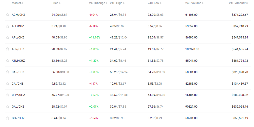 Держатели фан-токенов могут торговать ими на Chiliz Exchange — централизованной бирже фанатских токенов, интегрированной с Socios.com, а также на других платформах-партнерах. У CHZ и фан-токенов нет майнинга, но команда Chiliz рассматривает возможность добавления стейкинга.