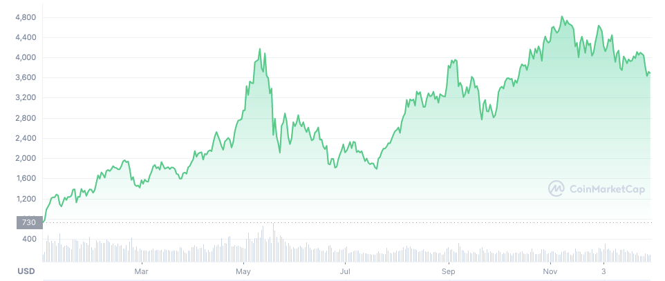 На фоне этого котировки ЕТН несколько раз обновляли свои максимумы: в мае они поднялись до $4 330, в октябре — до $4 445, а в ноябре — до $4 859. Однако цена ETH удерживалась на этих отметках недолго и после пиков опускалась на десятки процентов.