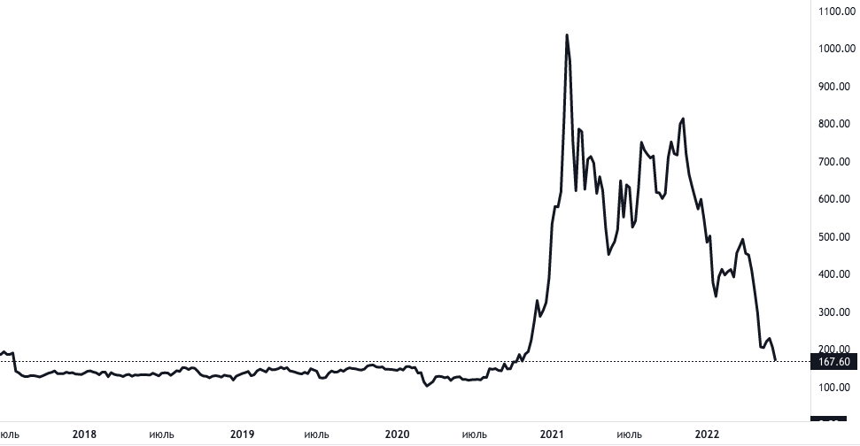 Инвестиции в ВТС стали драйвером роста MSTR, но и перенесли на бумаги компании волатильность крипторынка. Всего за полгода после покупки биткоина акции MicroStrategy выросли на пике более чем в 9 раз. Но с февраля 2021-го они сильными отскоками снижаются и сейчас торгуются ненамного выше, чем в августе 2020-го — около $168 против $140.