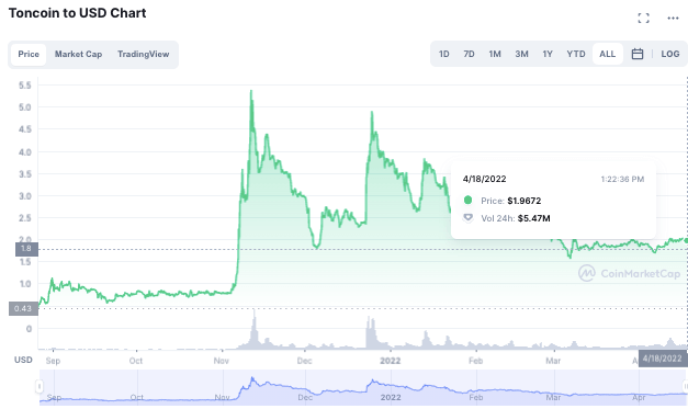Монета Toncoin. Toncoin используется участниками для оплаты всех действий в сети, стейкинга и голосования. Монета стала торговаться в августе 2021 года на отметке около $0.43. В ноябре после начала рекламной кампании она за две недели взлетела с $0.7 до $5.8. После этого цена снижается с резкими падениями и ложными отскоками, и сейчас монета торгуется на уровне $1.97. Капитализация проекта составляет $2.4 млрд (больше чем весь долг Telegram перед инвесторами и кредиторами). Всего создано 5 млрд Toncoin.