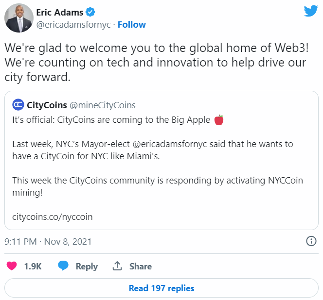 Майнинг NYCCoin, собственного токена Нью-Йорка, был запущен 11 ноября (не путать с валютой NewYorkCoin (NYC), запущенной в 2014 году). Никакого официального сотрудничества между муниципалитетом города и CityCoins пока нет, но город в любой момент может получить доступ к средствам на своем кошельке. Адамс публично поддержал запуск NYCCoin в Twitter.