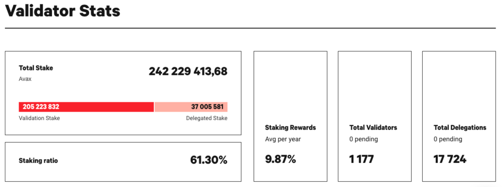Чтобы стать валидатором, необходимо заблокировать минимальный стейк в 2 000 AVAX. По текущему курсу в $119 минимальный стейк валидатора составит $238 000. Свои AVAX также можно делегировать действующему валидатору, чтобы иметь возможность принимать участие в валидации транзакций сети. Для этого нужно не менее 25 AVAX на сумму в $2 975. Чем больше монет стейкает валидатор, тем чаще он проверяет других валидаторов.