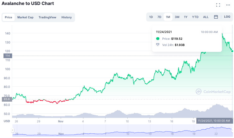 Именно эти возможности привлекают таких крупных игроков, как Deloitte, а также способствуют популяризации Avalanche среди криптопроектов. Сотрудничество с новыми игроками из мира традиционных финансов и запуск в экосистеме новых проектов из сектора DeFi могут стать теми драйверами роста, которые подтолкнут стоимость AVAX выше $150 в этом году. Однако надо помнить, что хайп на фоне подобных новостей быстро стихает. Так, с $146.22, которых монета достигла 21 ноября, к 24 ноября она упала до $119.52.