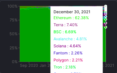 Далее по популярности идут так называемые «убийцы Ethereum»: Terra с 7.40%, Binance Smart Chain c 6.69%, Avalanche c 4.81%, Solana c 4.64%, Fantom c 2.26%, Polygon c 2.21% и TRON c 2.18%. На остальные блокчейн-сети приходится менее 1% всех DeFi-протоколов.