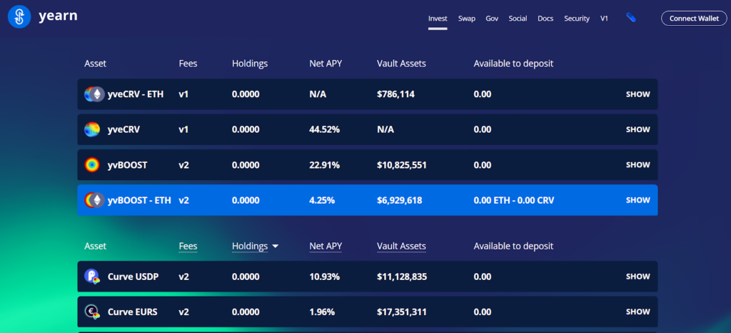 yVaults — это самый популярный продукт экосистемы yearn․finance, предназначенный для получения максимального дохода в различных кредитных протоколах. Эти хранилища представлены в виде специальных протоколов, которые позволяют поставщикам ликвидности вносить депозиты в криптовалютах и зарабатывать на различных торговых стратегиях. Как мы писали выше, поставщики ликвидности взамен депонированных активов получают токены yToken в соответствии с их долей в пуле.