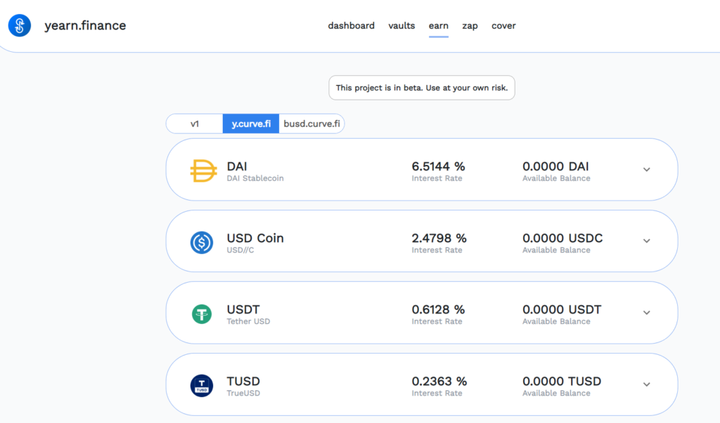 Как и в случае с yVaults, в Earn средства пользователей автоматически перемещаются между различными кредитными DeFi-протоколам по мере изменения процентных ставок. Однако Earn поддерживает только стейблкоины и токенизированные биткоины — DAI, USDC, USDT, TUSD, sUSD и wBTC.