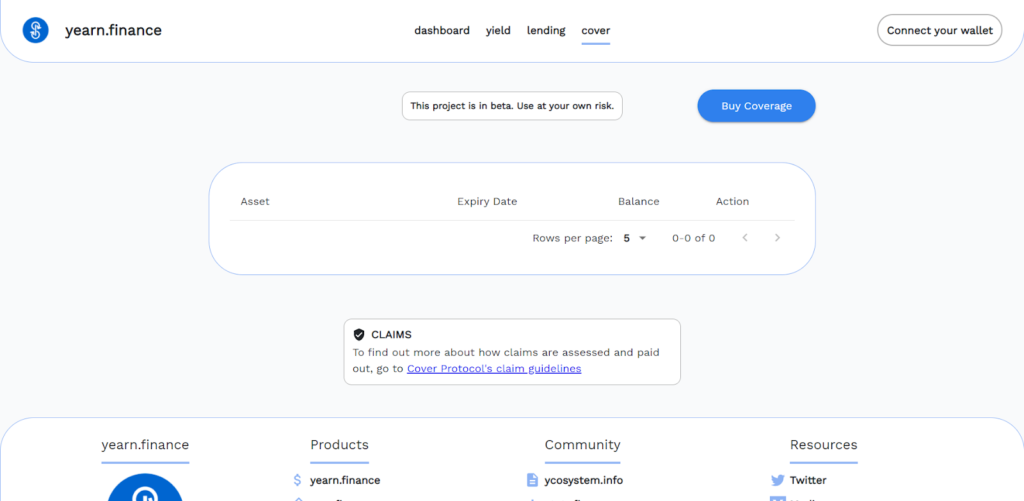 Cover — это протокол страхования депозитов в DeFi-протоколах, который позволяет пользователям получать компенсации в случае финансовых потерь. Компенсация выплачивается в YFI и зависит от общей суммы внесенных в yearn․finance активов. На данный момент этот сервис также представлен в бета-версии.