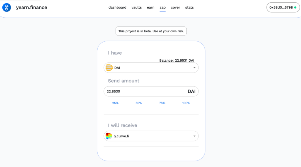 Zap — это удобный инструмент экосистемы, который позволяет в один клик вносить депозиты в протоколы yVaults. Для этого сервис обменивает стейблкоины пользователя на токены провайдера ликвидности. Поддержкой и интеграцией Zap занимается другой популярный DeFi-протокол — Zapper.