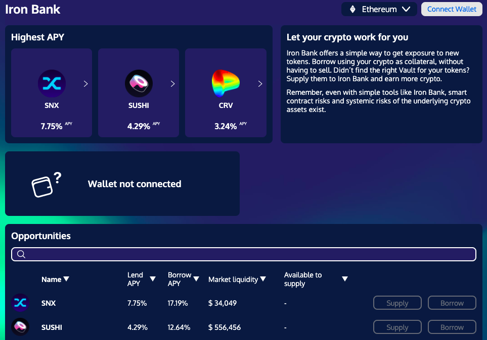 В октябре 2021 года yearn․finance сообщил о запуске нового продукта Iron Bank на базе блокчейна Fantom, созданного в рамках партнерства с другим популярным DeFi-протоколом — C.R.E.A.M. Finance.