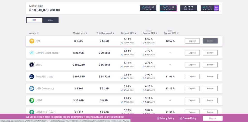 Как и в случае с другими лендинговыми протоколами, Aave предлагает услуги для заемщиков и кредиторов. Как и у Compound, процентная ставка по депозитам рассчитывается алгоритмом, который определяет уровень спроса и предложения на актив в пуле.