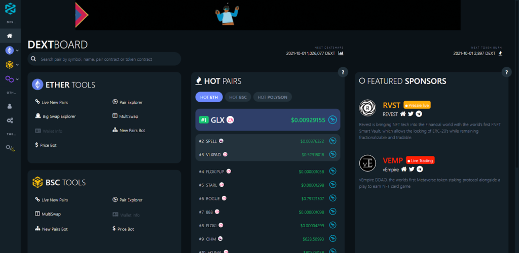 DEXTools (DEXT) — популярный аналитический сервис, который предоставляет данные по всем DEX- и DeFi-рынкам. DEXTools позволяет в режиме реального времени отслеживать котировки активов из сетей BSC, Ethereum и Poligon, а также следить за листингом новых токенов на различных DEX.