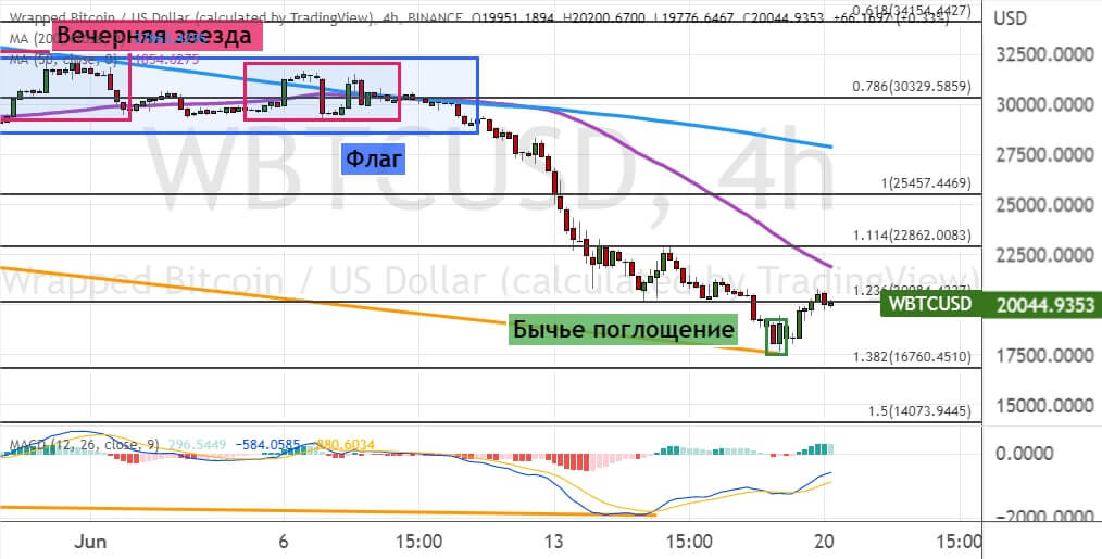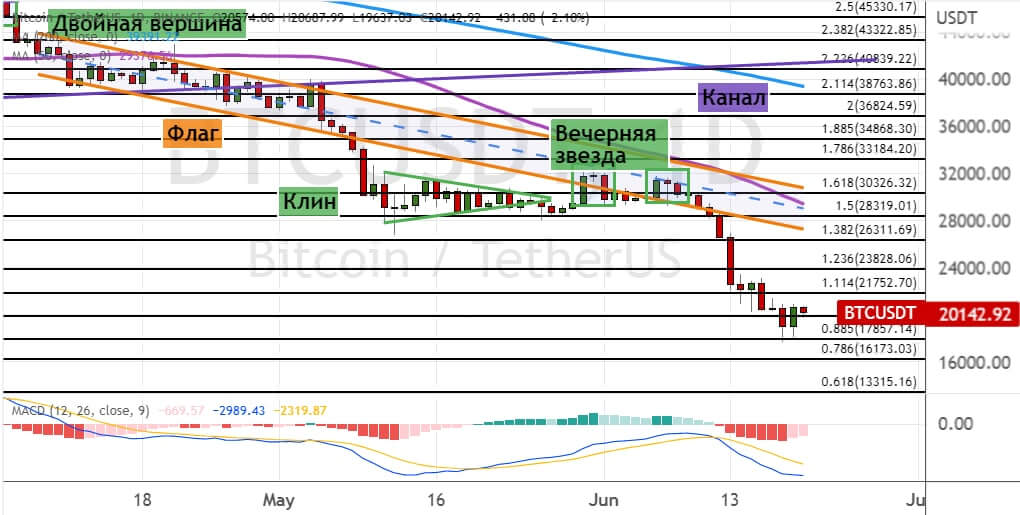 Закрытие дневных свечей ниже $20 000 приведет к развитию медвежьего движения в район уровней $17 800 и $16 200. Сохранение тренда на снижение направит BTC к целям $15 000 и $13 300. В пользу реализации этого прогноза указывают шесть сигналов: модели теханализа «Двойная вершина» (обозначена линиями зеленого цвета) и «Висячий человек», а также пробитие нижних границ «Восходящего канала» (линии фиолетового цвета), «Флага» (линии оранжевого цвета) и две свечные комбинации «Вечерняя звезда».