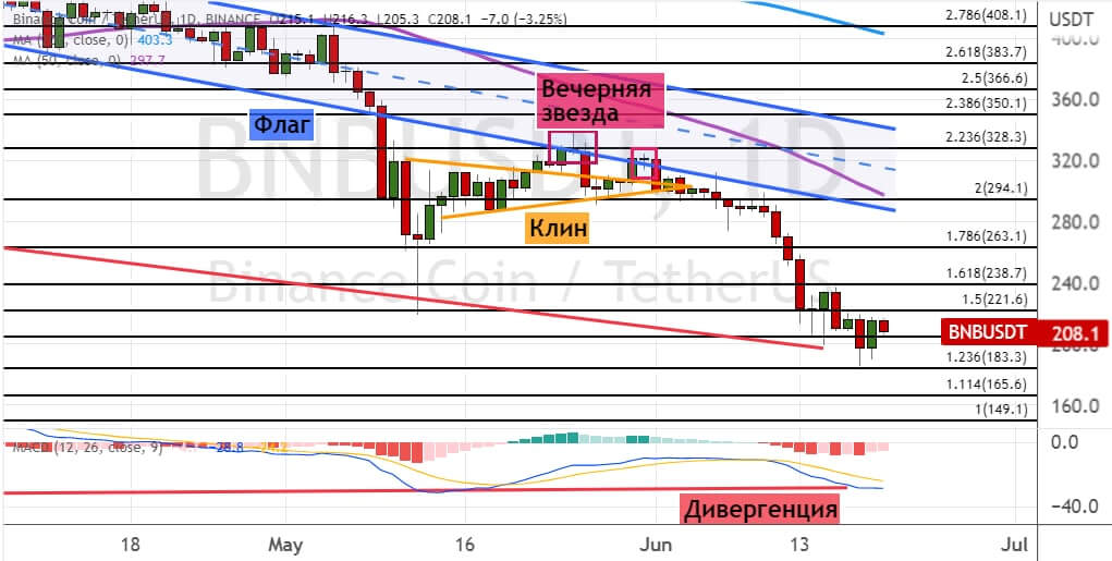 Котировки BNB развивают консолидацию между уровнем поддержки $200 и сопротивлением $221. Сигналом о развитиии нисходящего тренда станет падение котировок альткоина ниже уровня $200. В таком случае BNB направится к целям $180, $165 и $150. В пользу реализации этой идеи указывают четыре сигнала теханализа: пробитие границ «Флага» (обозначена синим цветом) и «Клина» (обозначена оранжевым цветом), а также две модели «Вечерняя звезда».