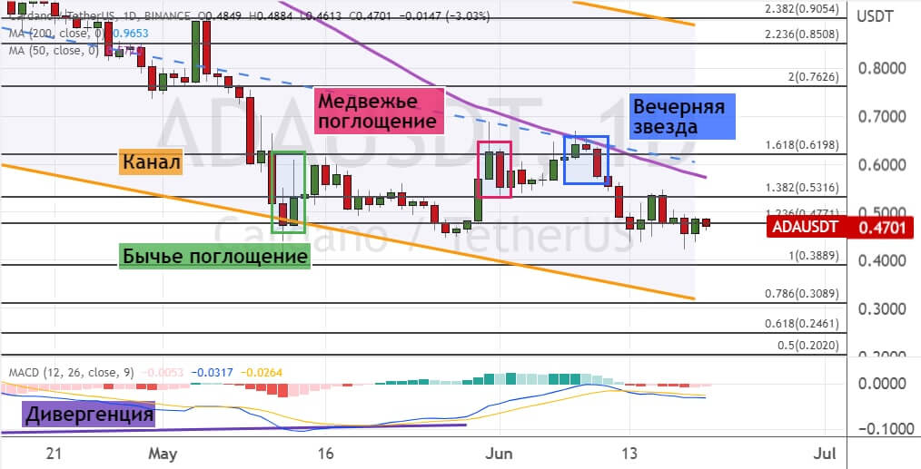 Котировки ADA продолжают консолидироваться в районе уровня $0.48. Развитие новой волны нисходящего движения приведет к падению стоимости актива до поддержки $0.4. На вероятность реализации этого варианта торгов указывают два сигнала: модели теханализа «Медвежье поглощение» (обозначена красным цветом) и «Вечерняя звезда» (обозначена синим цветом). Более глубокая коррекция приведет к падению стоимости ADA ниже $0.41. А следующими целями для медведей выступают уровни $0.31, где проходит нижняя граница модели теханализа «Канал», $0.25 и $0.2.