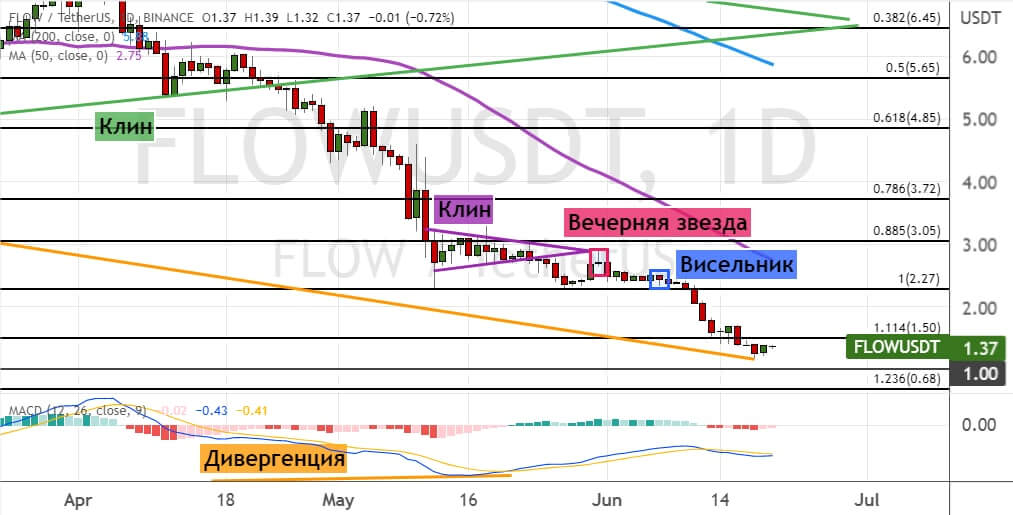 Сохранение нисходящего тренда приведет к снижению FLOW до уровня поддержки $0.7. В пользу сохранения медвежьей динамики указывают четыре сигнала: пробитие границ двух моделей «Клин», а также формирование моделей теханализа «Вечерняя звезда» и «Висельник».