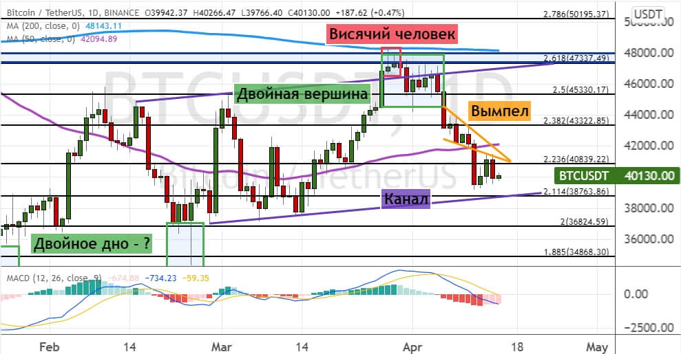 Сохранение нисходящего импульса приведет к снижению стоимости биткоина до уровня $38 800. В районе него также проходит нижняя граница модели теханализа «Канал» (обозначена на графике ниже линиями фиолетового цвета). Более глубокая коррекция может привести к обвалу биткоина до $36 800 и $34 800. В пользу реализации этой идеи указывают три сигнала: модель теханализа «Вымпел» (обозначена на графике ниже линиями оранжевого цвета), свечная комбинация «Висячий человек» и модель «Двойная вершина» (обозначена на графике ниже линиями зеленого цвета).