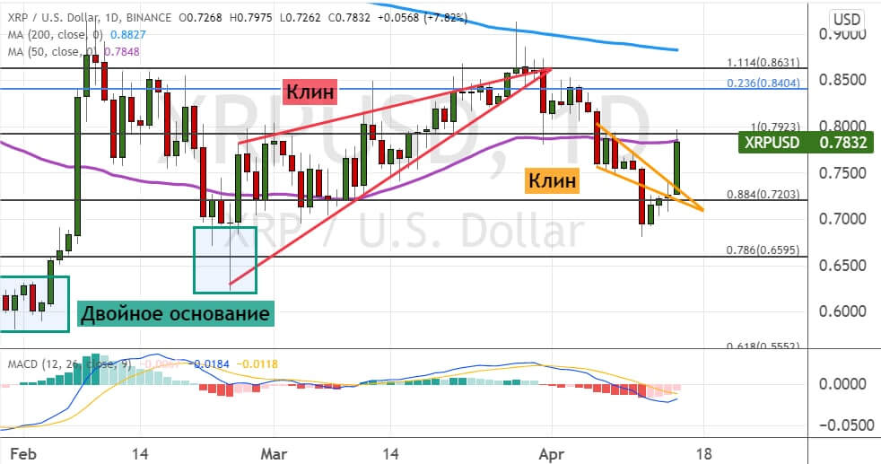 После преодоления верхней границы модели теханализа «Клин» (на графике ниже обозначена оранжевым цветом) котировки XRP устремились в район текущего сопротивления $0.8, где также проходит линия 50-дневной SMA. Сохранение восходящего тренда приведет к росту стоимости XRP до границ кластера уровней $0.84–$0.86. Чуть выше этого кластера также проходит линия 200-дневной SMA.