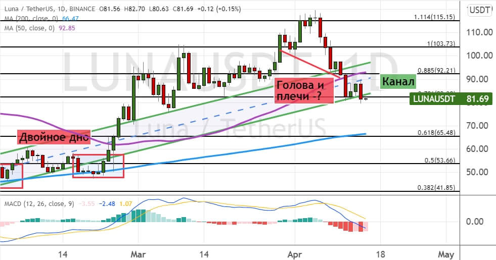 Лидером на рынке DeFi остается криптовалюта LUNA, которая торгуется в районе $82, где проходит нижняя граница модели теханализа «Канал» (обозначена на графике ниже линиями зеленого цвета). Развитие коррекции приведет к обвалу стоимости LUNA до уровней поддержки $70 и $65. В пользу реализации этой динамики указывает модель теханализа «Голова и плечи» (обозначена на графике ниже линиями красного цвета).