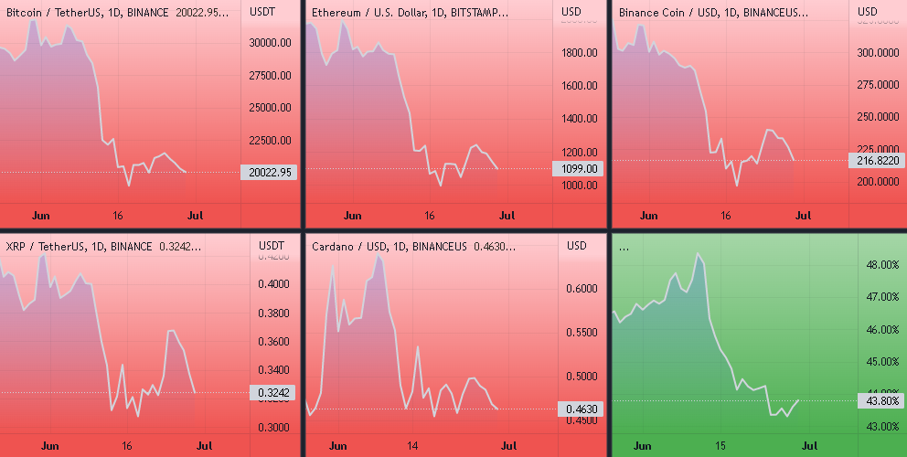Динамика котировок BTC, ETH, BNB, SOL, XRP (дневной таймфрейм) и график доминации биткоина. Источник