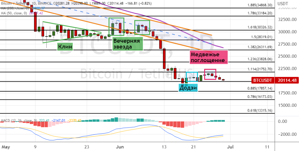 Закрытие дневных свечей ниже $20 000 позволит медведям обвалить стоимость биткоина к первым целям $19 000, $17 800 и $16 200. Более глубокая коррекция направит котировки до уровней $15 000 и $13 300. В пользу реализации этого прогноза все еще указывают семь сигналов: модели теханализа «Медвежье поглощение», «Додзи» (обозначена линиями бирюзового цвета) и «Висячий человек», а также пробитие нижних границ «Восходящего канала» (линии фиолетового цвета), «Флага» (линии оранжевого цвета) и две свечные комбинации «Вечерняя звезда».