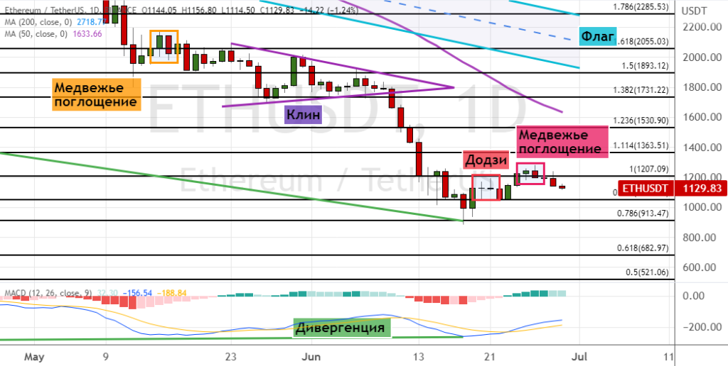 В случае закрытия дневных свечей ниже $1 000 стоимость ETH опустится к первым целям на уровнях $920, $800 и $680. На возможное восстановление медвежьего тренда и здесь указывают семь сигналов теханализа: модели «Додзи», «Голова и плечи» (границы отмечены линиями синего цвета), «Висячий человек», а также две модели «Медвежье поглощение» (границы обозначены оранжевым цветом) и пробитие нижних границ «Флага» и «Клина».