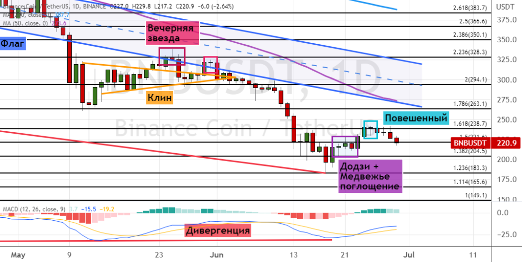 С начала недели котировки BNB опустились до поддержки на уровне $220. В пользу развития медвежьей динамики указывают семь сигналов теханализа: модели теханализа «Повешенный», «Додзи», «Медвежье поглощение» и две модели «Вечерняя звезда», а также пробитие границ «Флага» (обозначен синим цветом) и «Клина» (обозначен оранжевым цветом). Первыми целями для медвежьей динамики станут уровни $180, $165 и $150.