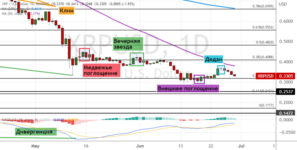 Более глубокая коррекция направит стоимость альткоина к поддержкам $0.4, $0.31 и $0.25. В районе $0.25 также проходит нижняя граница модели теханализа «Канал». В пользу развития краткосрочного медвежьего тренда указывают четыре сигнала: две модели теханализа «Додзи», а также модели «Медвежье поглощение» (обозначена красным цветом) и «Вечерняя звезда» (обозначена синим цветом).