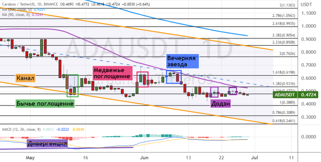 Сигналом о восстановлении бычьей динамики станет закрытие дневных свечей выше уровня $0.53, где также проходит линия 50-дневной SMA. В таком случае в краткосрочной перспективе ADA может достичь целей 0.62, $0.7, $0.76 и границ кластера $0.85–$0.9. В районе $0.85–$0.9 также проходит верхняя граница «Канала» и линия 50-дневной SMA. В пользу реализации этого прогноза указывают два сигнала: модель теханализа «Бычье поглощение» (обозначена зеленым цветом) и бычья дивергенция между ценой на графике и осцилляторе MACD.