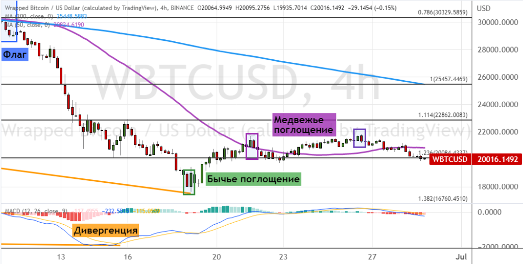 Закрытие нескольких четырехчасовых свечей ниже $20 000, где также проходит линия 50-периодной SMA, приведет к падению стоимости токена до первых целей $18 000 и $16 700. Более глубокая коррекция направит WBTC к уровням $15 000 и $14 080. В пользу сохранения медвежьей динамики указывают четыре модели теханализа — две модели «Медвежье поглощение», «Вечерняя звезда» и «Флаг».
