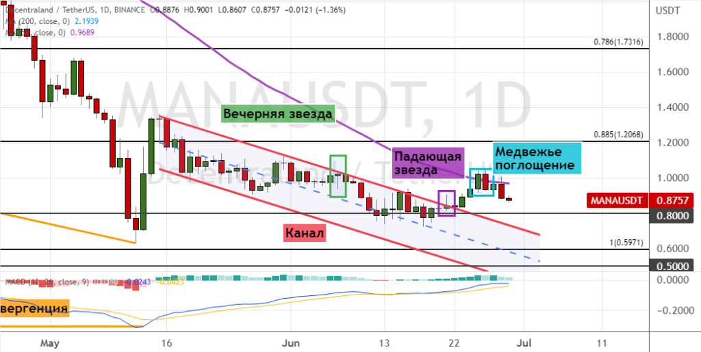 Закрытие дневных свечей ниже $0.8, а также формирование моделей теханализа «Медвежье поглощение», «Вечерняя звезда» и «Мертвый крест» станет сигналом о развитии медвежьей динамики. Первой целью для медведей выступит уровень поддержки $0.6. Более глубокая коррекция приведет к падению стоимости MANA до уровня $0.5.