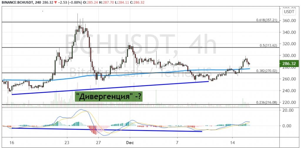 На фоне сохраняющейся дивергенции между ценой на графике и MACD котировки BCH уже достигли в моменте первого сопротивления $300. Уход выше него позволит активу протестировать $313.62 (50% коррекция по линиям Фибоначчи).