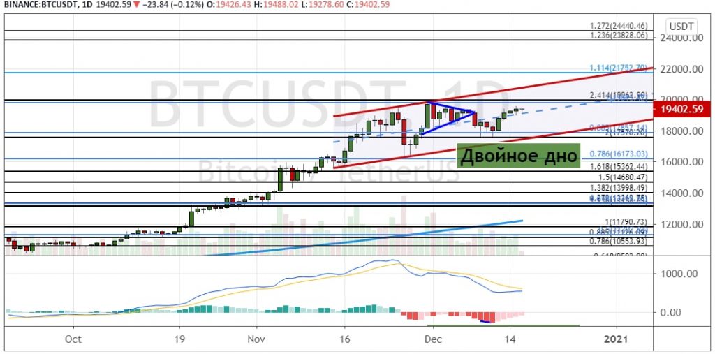 Биткоин продолжает развивать восходящую динамику, что позволило ему сегодня достичь психологически важной отметки $20 000. Отскок от поддержек в виде области $17 860 – $18 000 и $17 570 привел к первой цели $19 000. Ранее мы уже отмечали начало реализации бычьей дивергенции между ценой на графике и осцилляторе MACD и модели теханализа «Двойное основание».