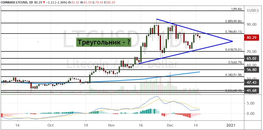 Лайткоин продолжает торговаться в рамках границ модели теханализа «Треугольник». Прорыв верхней грани этой фигуры остается приоритетным сценарием для развития восходящей динамики в среднесрочной перспективе.