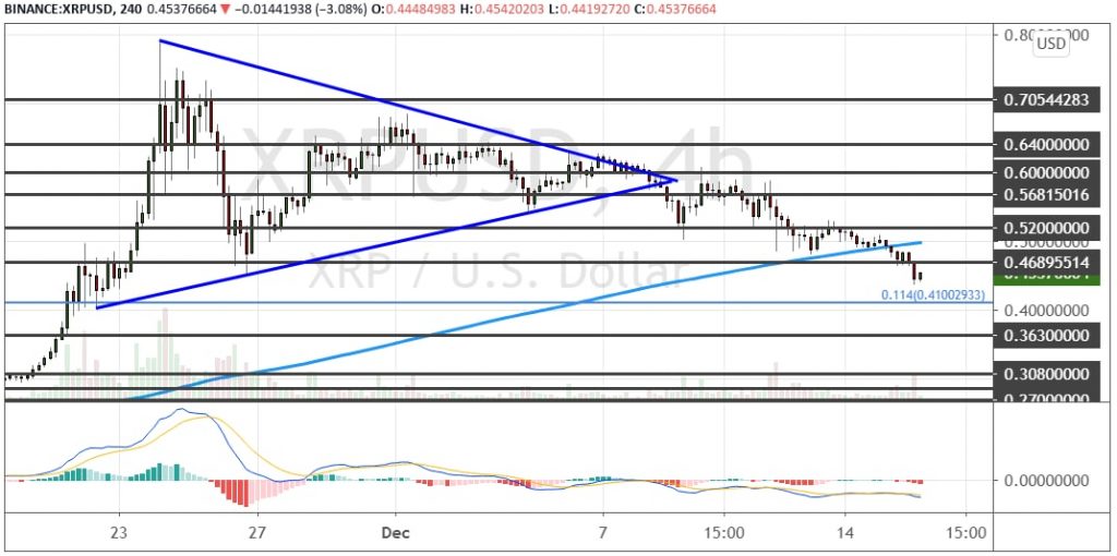 Рипл, наоборот, в последние дни теряет капитализацию, что уже привело к отскоку от сопротивления $0.52 и движению к первой цели $0.4690, выше которой проходит линия 200-дневной простой скользящей средней (SMA). Сохранение импульса может привести к развитию нисходящей динамики в район поддержки $0.41 (11.4% коррекция по линиям пропорции Фибоначчи). Следующая поддержка находится на уровне $0.36.