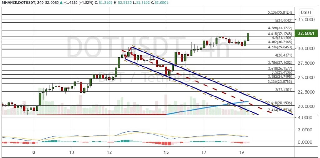 Это привело к тому, что котировки DOT отскочили от поддержки $30 к первым целям $30.80, $31.50 и $32.20. На графике ниже можно наблюдать сохранение тренда на рост, что может привести к достижению $33.20, $34.40 и среднесрочной цели $35.20, сформированных на основе линий пропорции Фибоначчи.