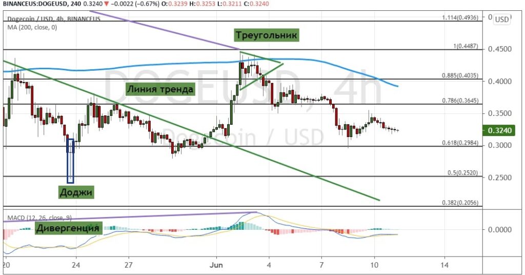 График Doge/USD, четырехчасовой таймфрейм.