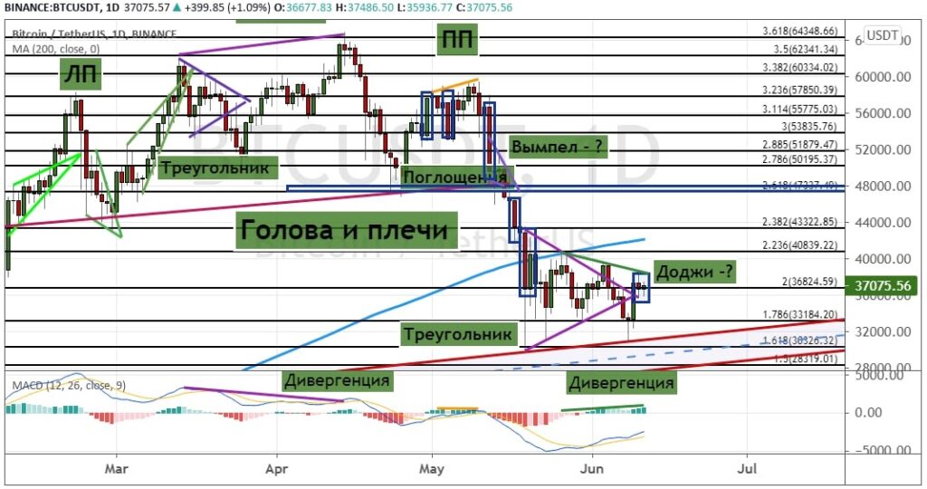 Несмотря на ряд положительных новостей биткоин после выхода за границы модели теханализа «Треугольник» (отмечена на графике ниже) не смог развить движение в рамках микротренда. Это привело к продолжению движения от поддержки на уровне $33 200 до сопротивления $38 000, ниже которого проходят текущие торги.